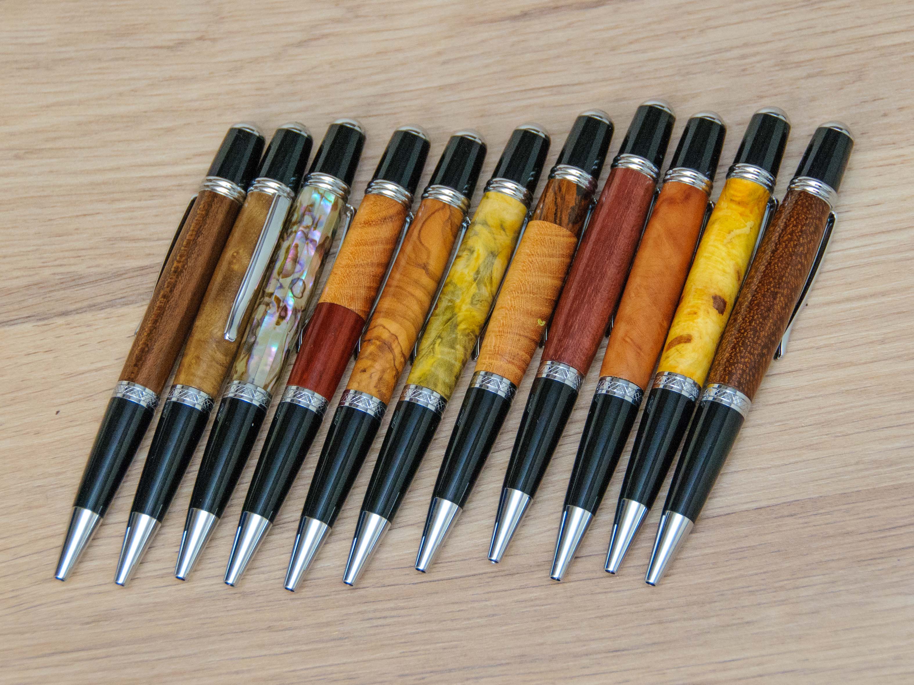 Per la realizzazione di penne ed alcuni tipi di trottole, invece, utilizzo legni e radiche provenienti da tutto il mondo (sud est asiatico, America del sud e del nord, Africa, Australia ...etc..), come: amboyna, pink ivory, ebano, afzelia buckeye, frassino nero, padouk, pallissandro, legno serpente, leopard wood, kauri golden... e tantissimi altri!!